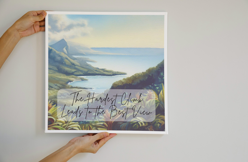 A watercolor illustration of a coast with a mountain and a quote. The quote says “The Hardest Climb Leads to the Best View”. It means hard work pays off. The colors are bright and contrast well. The picture has a white frame. It could be used for different purposes or inspire creative writing.