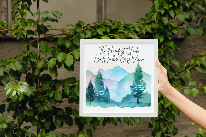 A pastel watercolor of a mountain landscape and a quote. The quote says “The Hardest Climb Leads to the Best View”. It means hard work pays off. The picture is calm and peaceful. It could be used for different purposes or inspire creative writing.