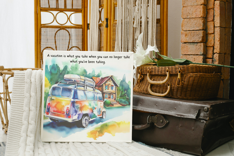 A rainbow van with a surfboard on a lake. The quote says “A vacation is what you take when you can no longer take what you’ve been taking.” It means people need a break sometimes. The picture is fun and relaxing. It could be used for different things or inspire creativity.